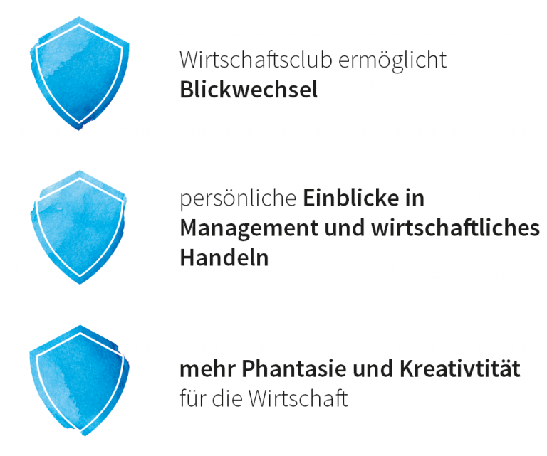 Wir alle brauchen Kunst und Literatur, um die Welt zu verstehen. Wir im Wirtschaftsclub gewinnen neue Einsichten im Blickwechsel und aus der Distanz. Wir sind davon überzeugt, dass der Dialog zwischen Wirtschaft, Kunst und Literatur für alle Seiten Inspiration und neue Perspektiven für das eigene Tun eröffnet.